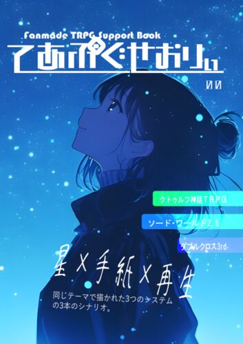 「星×手紙×再生」をテーマにした3つのシステムのシナリオ3つ。クトゥルフ神話TRPG、ソードワールド2.5、ダブルクロス3rdのシナリオとソロジャーナルが掲載されています。