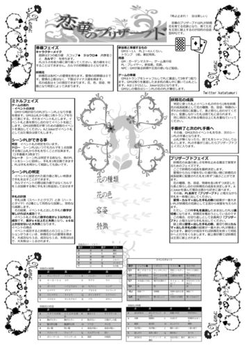 恋華のプリザーブド - desktheory - BOOTHトランプ一組と筆記用具、参加者が集まれば遊べるゲームです。 GMはいても居なくてもOK.ルールシートの中央が妖精花シート、四隅がPLシートになっているよ。妖精花を育成し、美しい姿のまま永遠を与える会話型ロール…